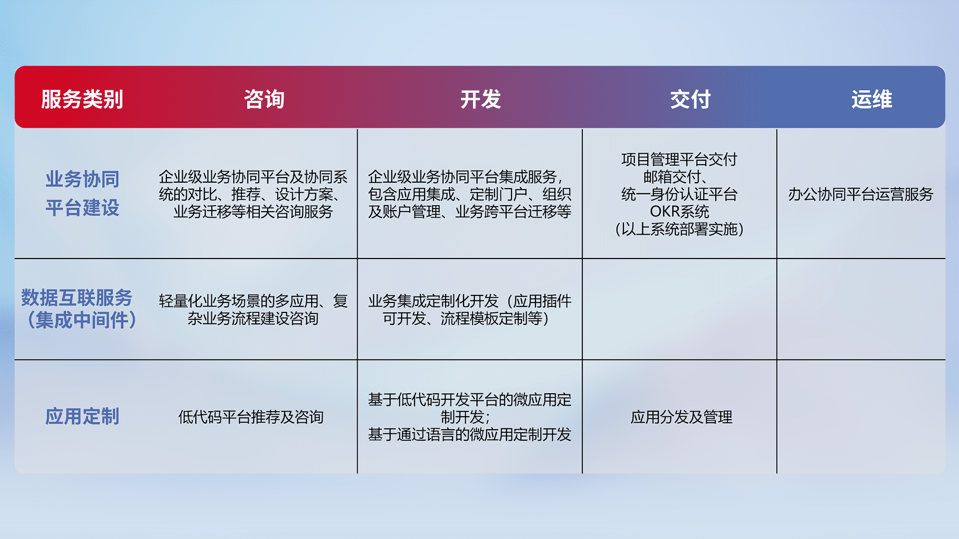 针对钉钉、、、企微、、、、IDaas等平台级产品提供产品的规划、、方案、、、、交付、、、定制化开发等服务,,,实现如统一协同办公、、智能客户服务、、、混合会议管理、、、智能数据查询、、、等业务场景,,,,实现数字化转型。。