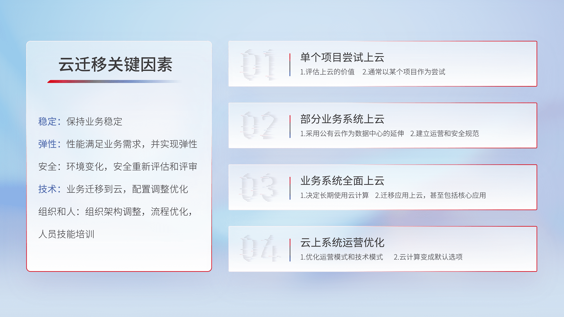 结合实际业务,,,从规划设计、、、、云平台选型、、、、云原生改造、、、数据迁移、、集成交付,,迁移全过程为客户识别最佳上云路径,,,做好风险识别管理,,设计网络架构、、、、身份权限、、、安全审计合规、、操作审计、、、日志审计、、、、监控告警策略、、多站点容灾设计等,,对云上基础设施进行整体规划,,提升IT治理水平,,,以满足弹性、、、高可用、、、、高性能的需求。。